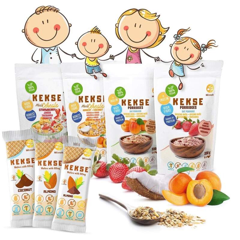 KEKSE RODINNÝ BALÍČEK Müsli Malina, Müsli Čučoriedka + Kokos, Ovsená kaša Čokoláda + Malina, Ovsená kaša...