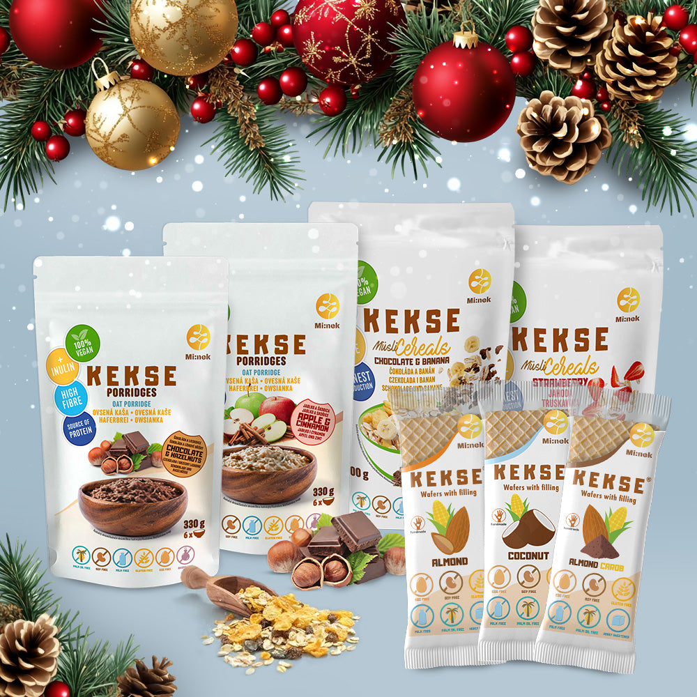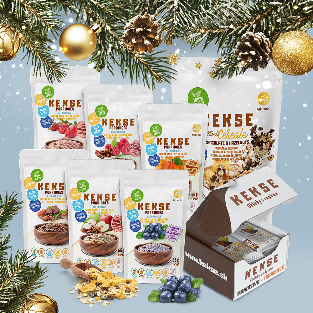 KEKSE Vianočný balíček 6 ks Müsli (Čučoriedka + Kokos, Čokoláda + Banán, Jahoda, Čokoláda +...