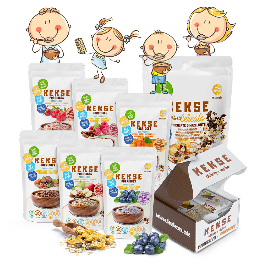 KEKSE RODINNÝ BALÍČEK Müsli Malina, Müsli Čučoriedka + Kokos, Ovsená kaša Čokoláda + Malina, Ovsená kaša...