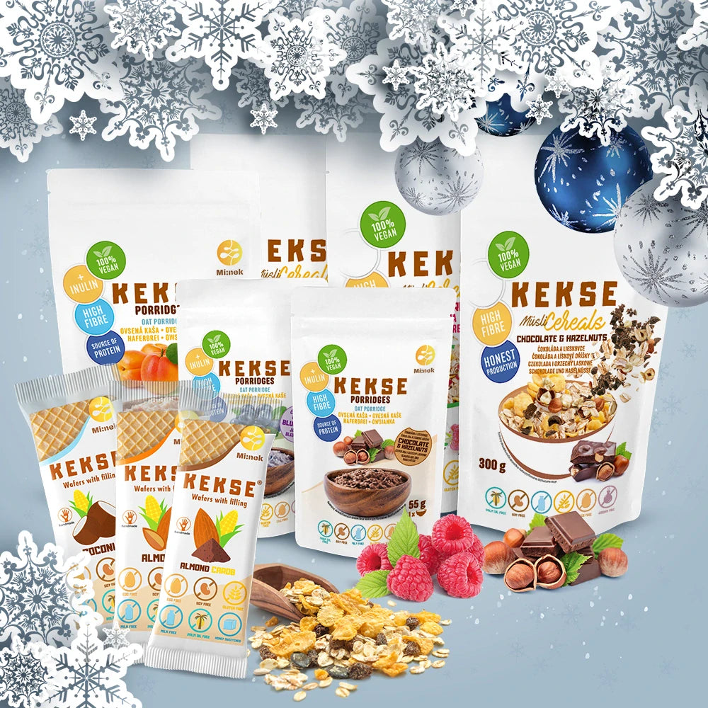 KEKSE Vianočný balíček 4 ks Müsli (Čokoláda + Lieskový oriešok, Marhuľa + Kokos, Malina, Čokoláda...