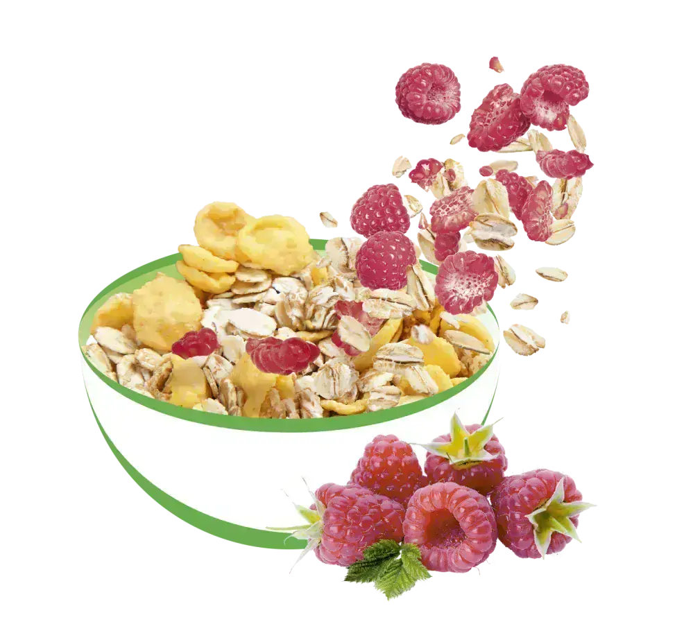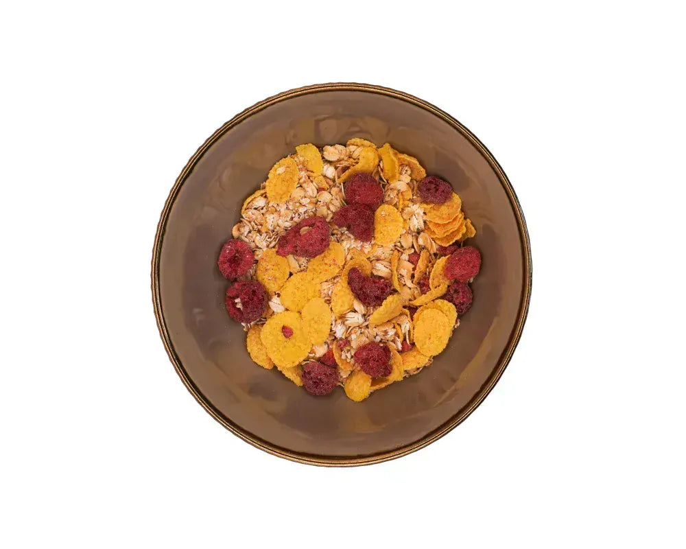 Lahodná müsli zmes s kúskami ovocia. Prirodzene bezlepkové a vegan s kúskami malín. Základom sú prémiové ovsené vločky a kukuričné lupienky.
